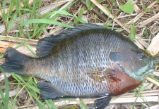 川岸に降りて準備、護岸際にドロップショットを落とすと、いきなりヒット。しかし、引きがバスとは違います。予想とおりブルーギルでした。しかし、ギルでも釣れるというのはうれしい。大分暖かくなってきて、魚の活性も上がっているようです。バスも釣れるかも知れないという期待が出ます。