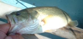 同じ場所でピッチングを繰り返しますが反応はありません。12時半をまわり、残り30分となったとき、ドロップショットにチェンジ。落しこんでしつこくシェイク。するとバラした場所でヒット。潜られないように思いきりリールをまき抜き上げました。巻きすぎてロッドの先までバスが来てしまってました。