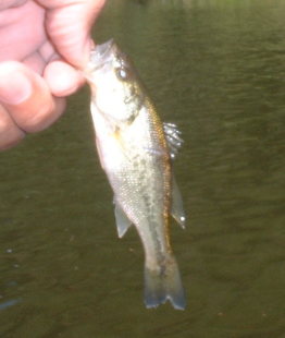 ドロップショットが根ががり、サオを振って外れたと思ったらそのワームが重くなってます。木の端でも刺さっているのかな、と引き上げると極小のバスの背中にスレで掛かってました。いままで見たブラックバスの中で最小サイズ。10センチありません。かわいそうでした。